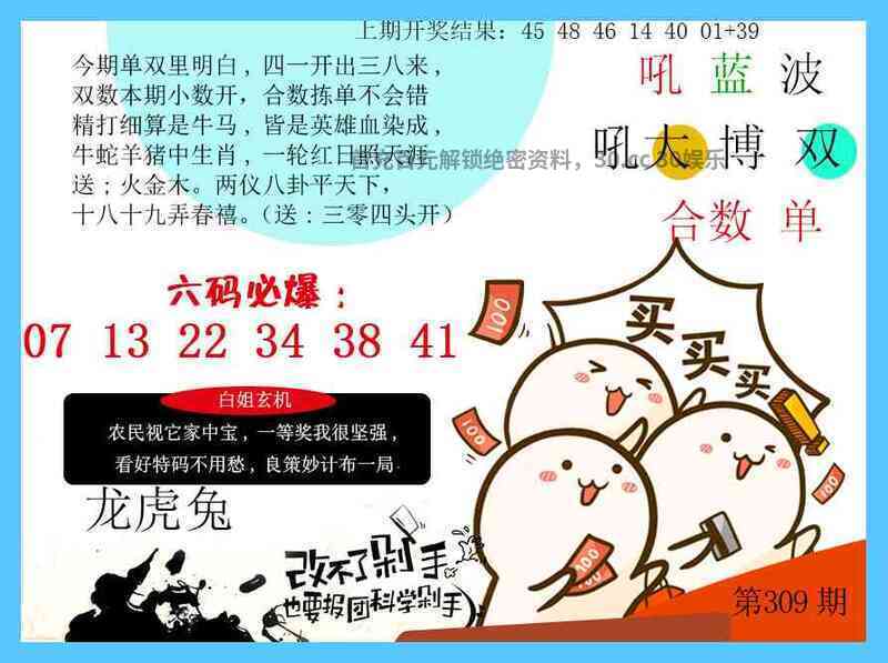 | 308期:⑧码 | 39.15.19.31.13.37.10.46 | 開:兔39 |